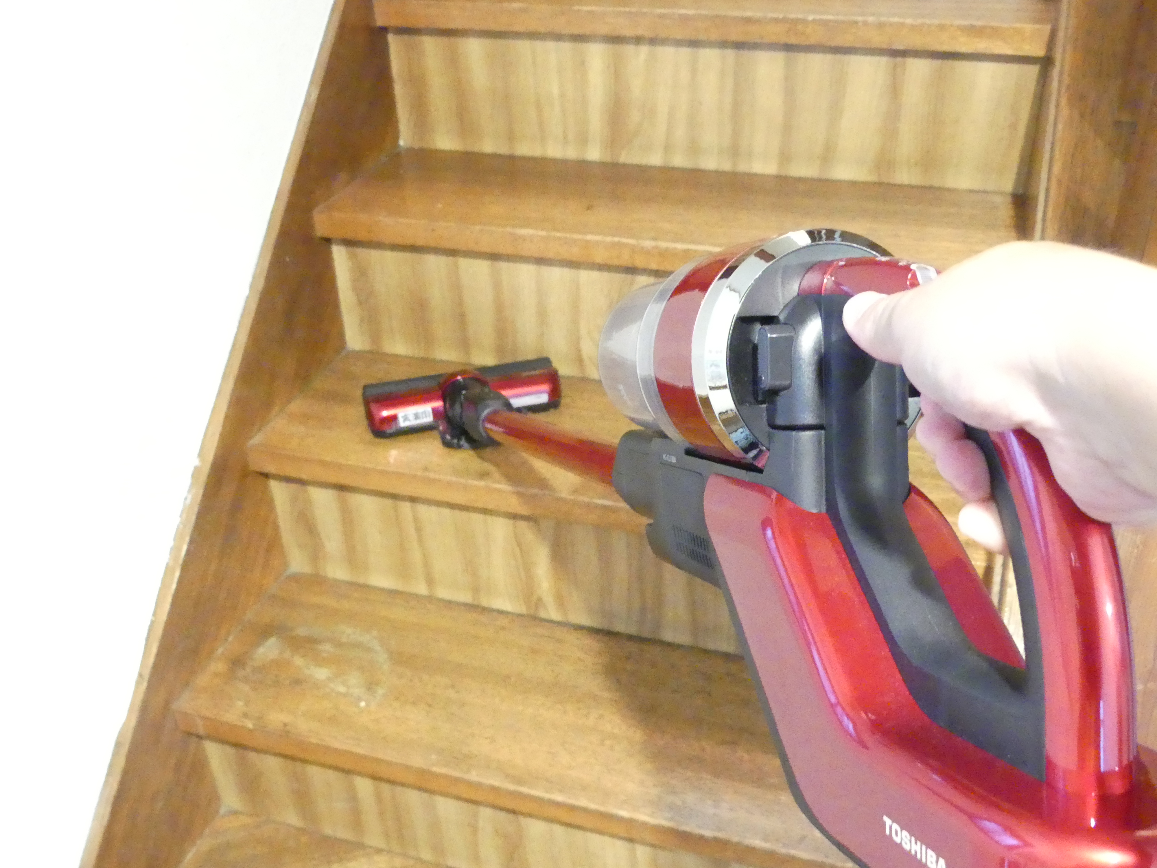 階段のようにクリーナーを持ち上げる必要がある場所で活躍。ノズルを変えればさらに軽くなる