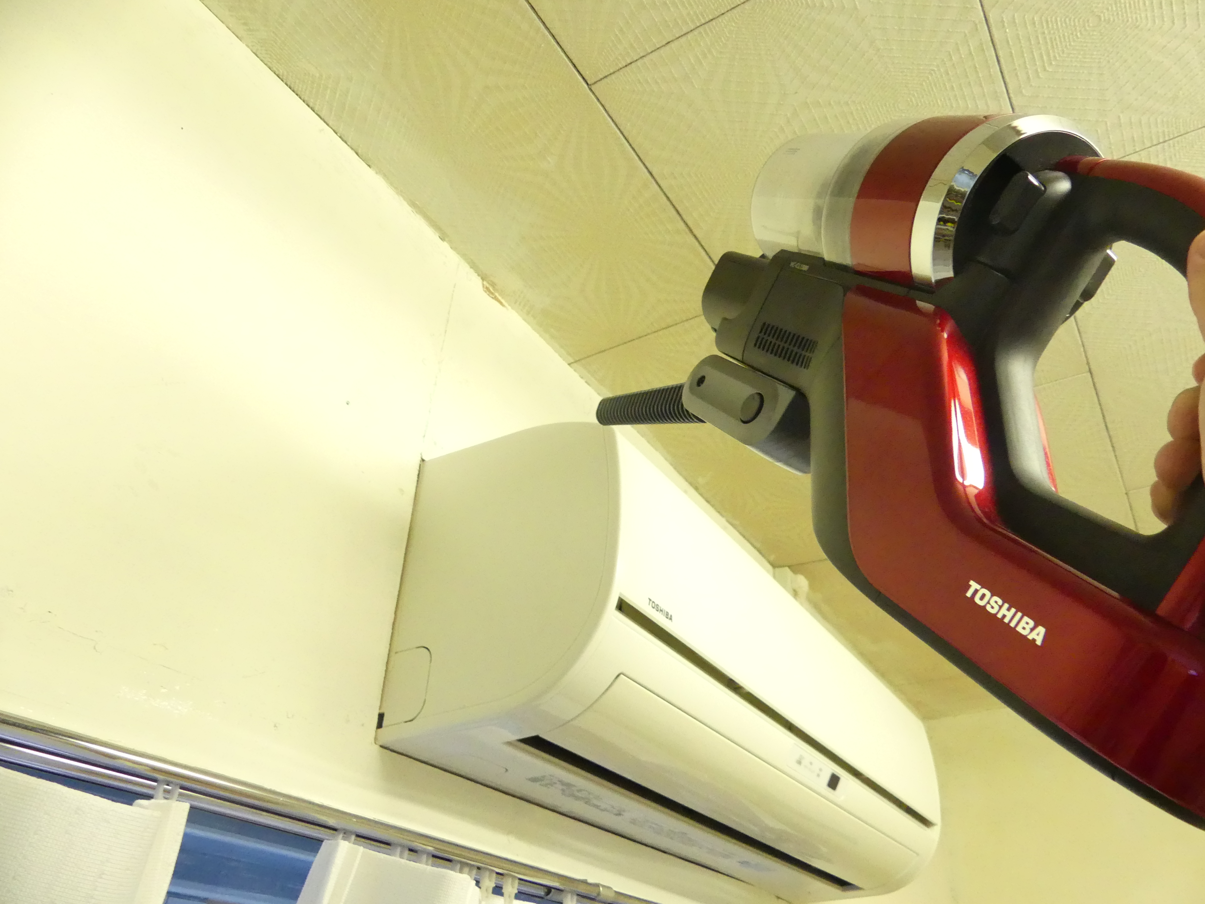 掃除の基本は部屋の上から。ということで、エアブローで棚やエアコンの上を吹き飛ばします。いわゆる昔でいうところの「はたき」の役割に近い。ほこりが飛ぶので、最後に床の掃除機がけをお忘れなく。