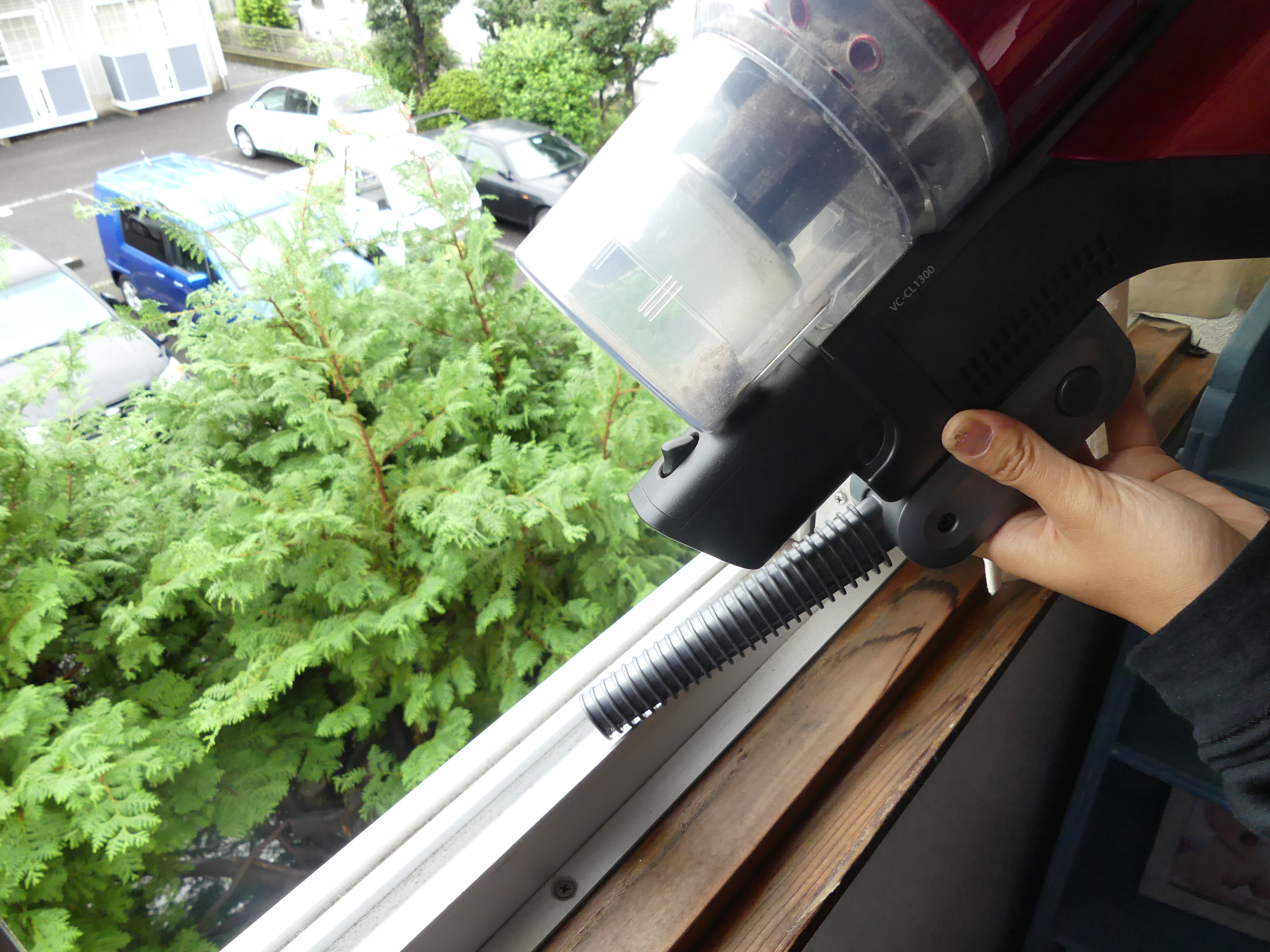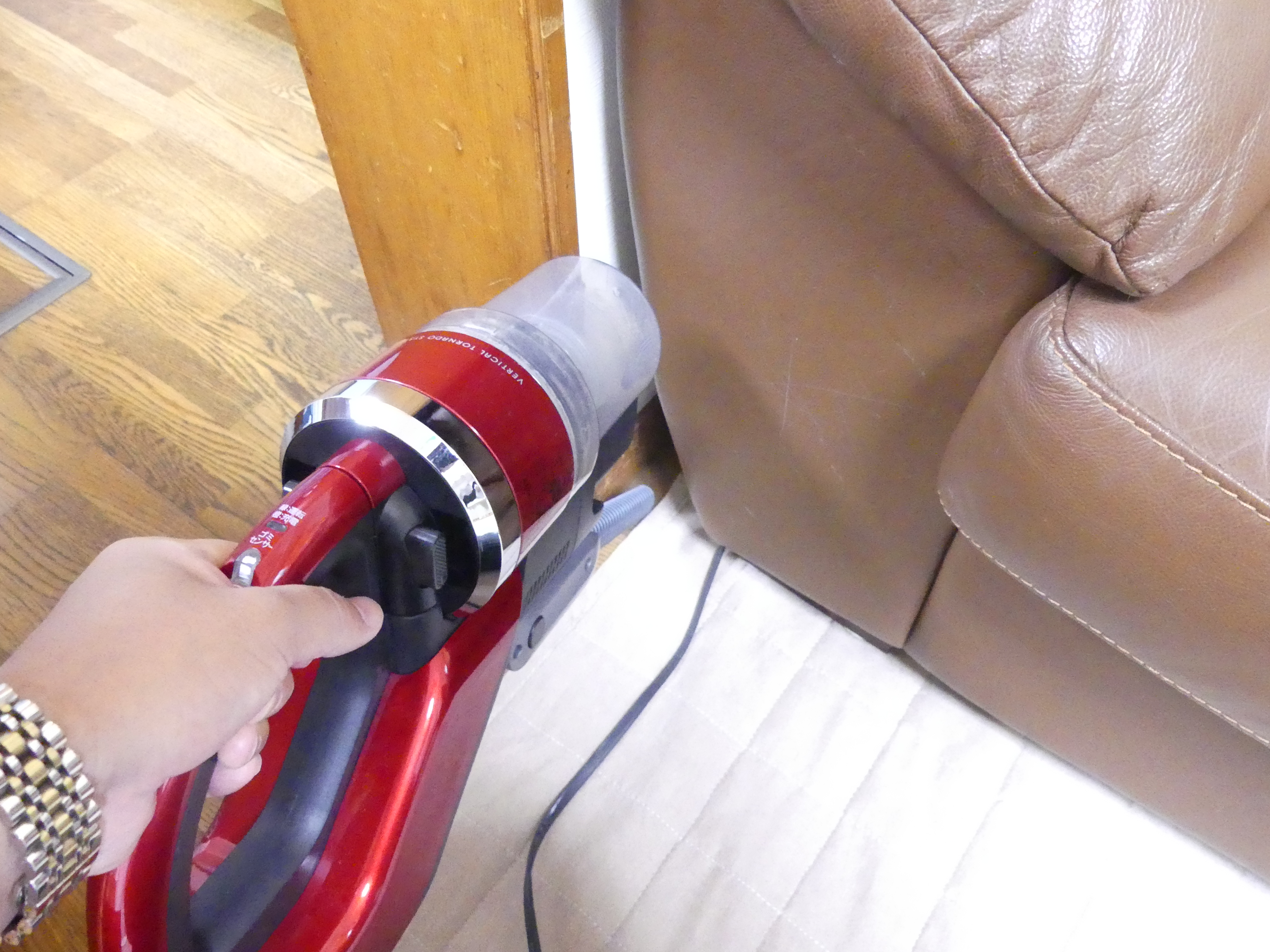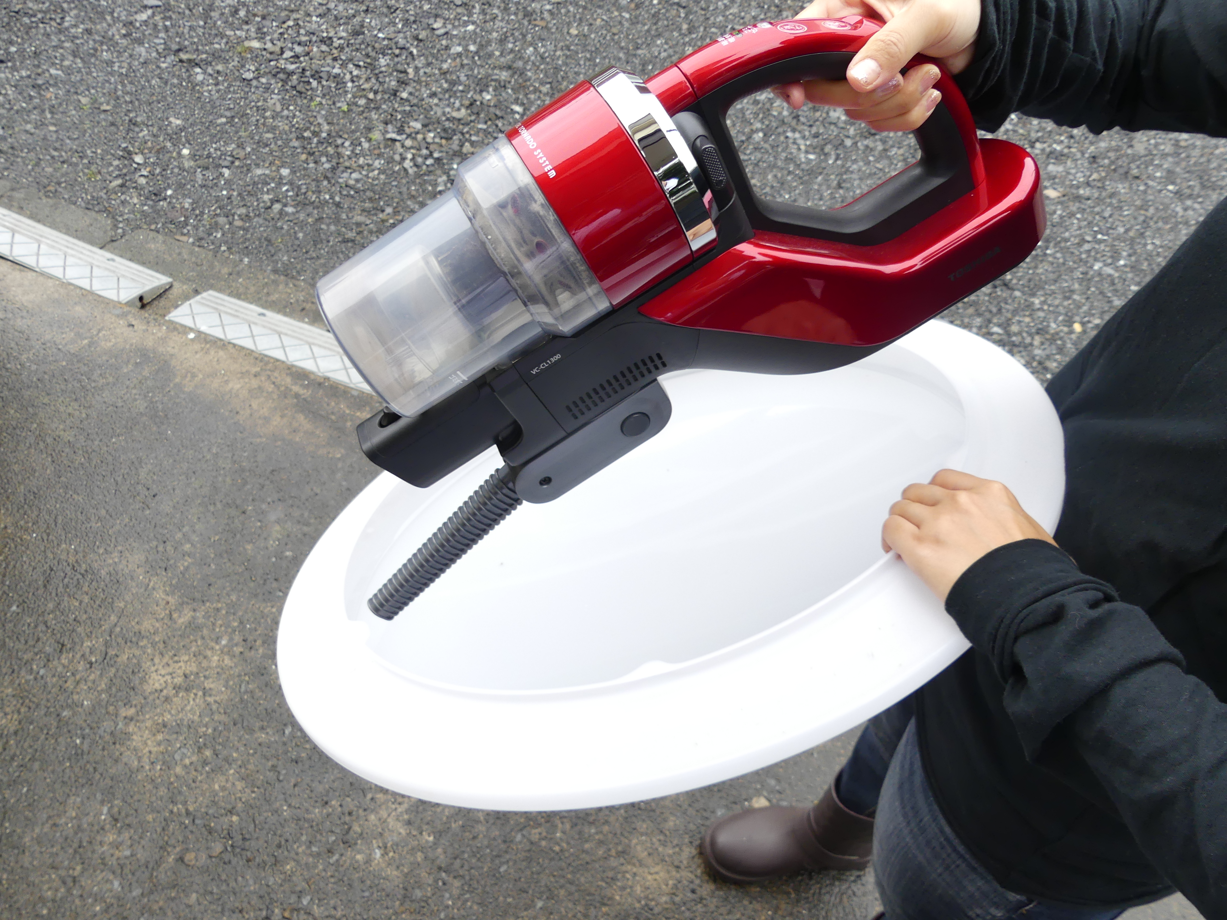 さて、このトルネオVコードレスで興味深いのが「エアブロー」機能を搭載していること。あまり聞き慣れない機能だと思いますが、掃除機でゴミを吸うのではなく、風が排出され反対に“吹き飛ばす”わけです。アタッチメントの一つであるエアブローノズルを本体下部に装着。スイッチをオンにすれば、「ブオォォォォー!」。なにこれ楽しい!