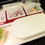 続いて運ばれてきた機内食にも変化が。容器の一部がエコな素材になっていたんです。2023年1月より主菜用の容器と蓋が、森林資源に配慮された国際的な認証を取得した紙素材になったんだそう。