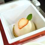 ドームシェイプのデザート「苺とオーガニックアールグレイのムース」は、ふわっととろける口当たり。しっかりとアールグレイの風味が効いていて、ちょっぴり大人なデザート。中央にクリームとソース層があり、美味しさを底上げ。洋生菓子がフライト中に味わえるのは個人的にも嬉しかったです。