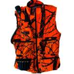 ベストの素材はポリエステル。表面はピーチスキン加工された梨地でサラっとした感じです。汚れが付きにくく、水気を弾く効果があります。雨が降らなくても、枝から落ちる雪や、雨後の竹やぶに入る時などに躊躇することがありません。襟元はフルジップタイプ。猟期は秋冬になりますので冷たい風の侵入を防いでくれます。