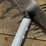 ハンドルが長いので、高い位置から振り下ろし、位置エネルギーを利用して土に深く刺すことができます。軽量なヘッドの不利な点を長いハンドルで克服しているカタチですね。ベントしたレーキは雑草の根をとらえ、テコの原理で土から根こそぎ掘り起こすことができるというわけです。
