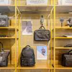 ▲PORTER flagship store 表参道店にディスプレイされた「POTR SCOPE」。左上「CLOUD CASE」(5万6100円)、左下「URBAN TOTE」(5万8300円)、中上「NOMAD PACK」(6万3800円)、中下「SOCIAL PACK」(6万500円)、右上「UTILITY BAG」(4万9500円)、右下「AUTHORIZED BRIEF」(6万6000円)全6型