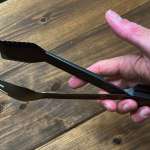 スパチュラにスプーンかスフォークを合体させるとトングになります。スパチュラの収納側とは反対側のスリットに差し込んで使います。ソロキャンプでは活躍の機会が多いであろうスキレット。皿に盛ることもなくスキレットで調理し、そのままそれで食事をする人も多いでしょう。また、焚き火台の上で焼き物を楽しむ人もいるでしょう。そんな時にこのトングが活躍します。