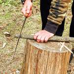 この方法だと、屈んで腰が痛くなることもないのでおすすめです。薪が短くなった場合は、左足の太もも部分と左手で薪を固定するのも良い方法です。