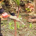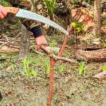 このように二股の枝を台にして切ると、腰を痛めることなく、カットしていくことができます。丁度良い枝がある場合は、足で挟むより楽です。