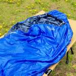 写真のように吊り下げると頭や足もとに糸に絡まっていないダウンが落ちちゃいますが、横に置いてフワッと均一にさせてから寝袋の中に潜り込めば、大きな偏りはなし。ふんわり包まれて朝までぐっすり眠れるんです。