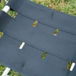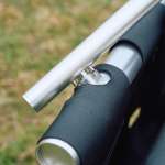 背もたれから続くウェビングの肘掛けは、肘を置くというよりも沿わせるというか体全体を包む感じ。肘をついて体を預けるのが好きな人は、物足りないかもしれません。ちなみに草地なのでわかりにくいのですが、地面と接する部分にはリング状の滑り止めがついていて、ウッドデッキやフローリングの上で使っても安心です。