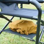 最後はキャプテンスタッグ「棚モック付きアルミディレクターチェア」。ブラックのアルミフレームにブラックの生地という、トレンドを押さえたデザインは、さすがキャプテンスタッグ。でも座ってみるとどうなんだよ…なんてイジワル気分で座ってみると、“これだよ、これ”と言いたくなる座り心地。幅広座面で大柄な人でも窮屈じゃないし、座面の張りも申し分なし。リラックス度満点です。