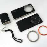 ▲Xiaomi 14 Ultra フォトグラフィーキット一式。手前右のオレンジのリングはデコレーションリングで、あらかじめ付いているシルバーのものと交換できる。左のリングは67mmフィルターのアダプター