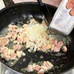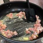 ▲フライパンにバターを入れて中火で熱し、鶏肉と玉ねぎの順に炒める様子