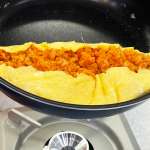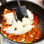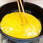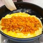 ▲全体が半熟状になったところでチキンライスをのせる様子