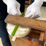 ▲「わっぱ」に「竹」を挟み、専用器具で押さえながら輪ゴムをし密封させます
