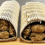 (4)これらを左手に持ち、海苔がゆるくならないように左右からやや締めながら巻く