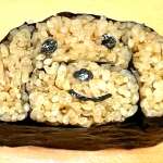(2)中央に「組み立て(1)で巻いた「口元」のパーツをのせ、その上に「80gの茶色のすし飯」を棒状にのせる