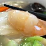 程なくしてサーブされた「海老入り麺」は、透き通ったスープにデーンと乗った海老と野菜のあんかけ炒めが絶品。鶏ガラと野菜の出汁が効いていて、高級店をも凌駕する味わい。もちろん自慢の細めストレートの自家製麺との相性も抜群で、次々にすすりたくなる病みつき感も。