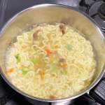 作り方もほぼ同じ。お湯を沸かし、麺とかやくを約5分茹で、茹で上がったら湯切りしスプーン約1杯分のお湯のみを残し、後のお湯は捨てます。