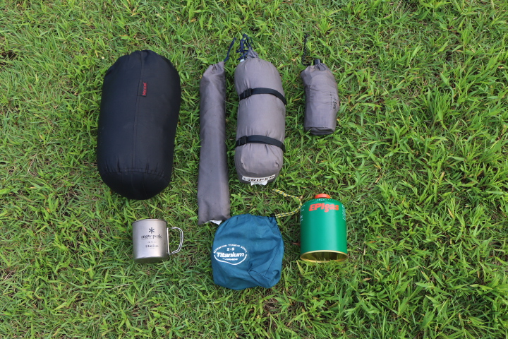 こちらが今回持っていったキャンプグッズ。1~2名用のテントとシュラフ、マット、クッカー、バーナーなど、ソロキャンプに必要なものは揃っています。