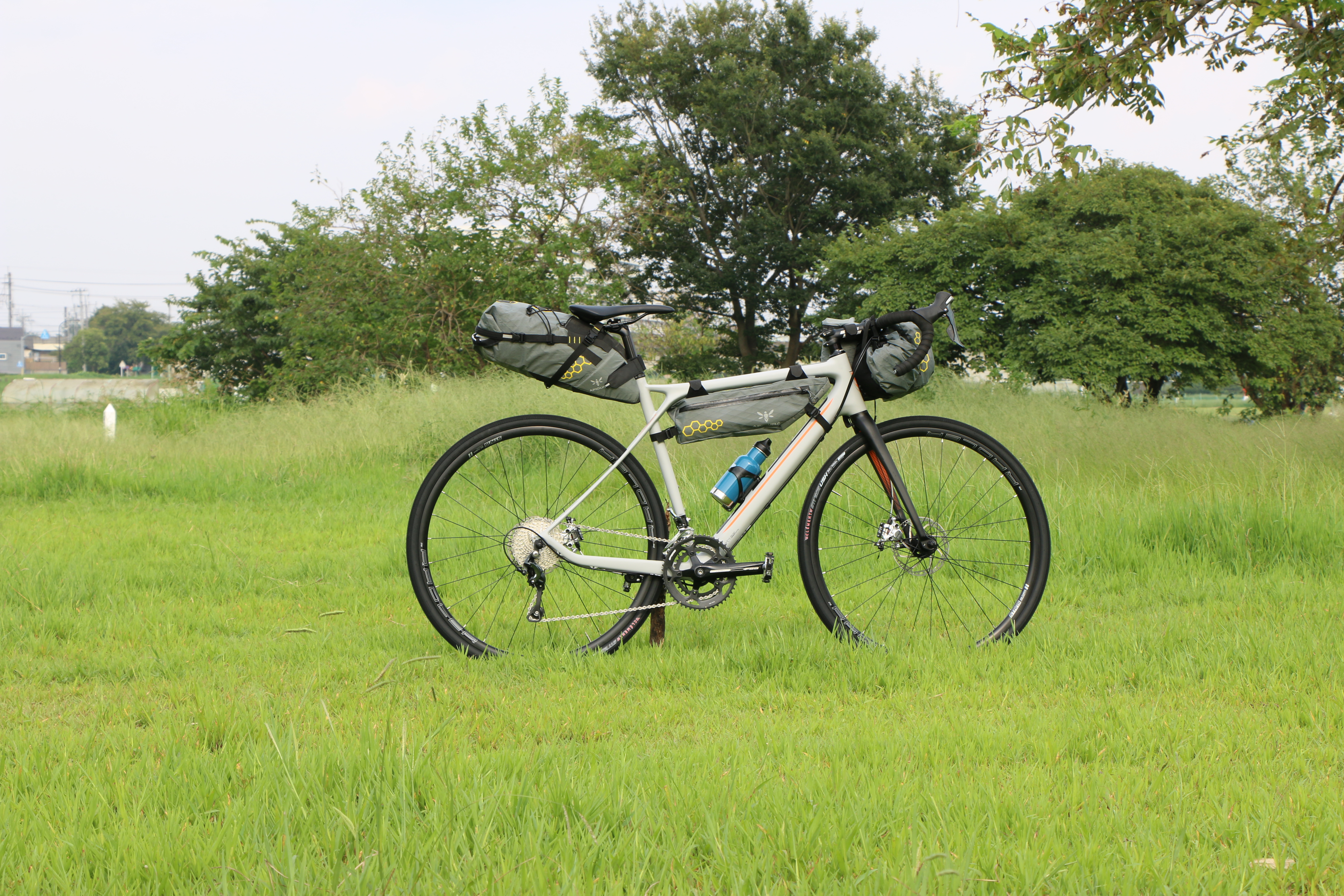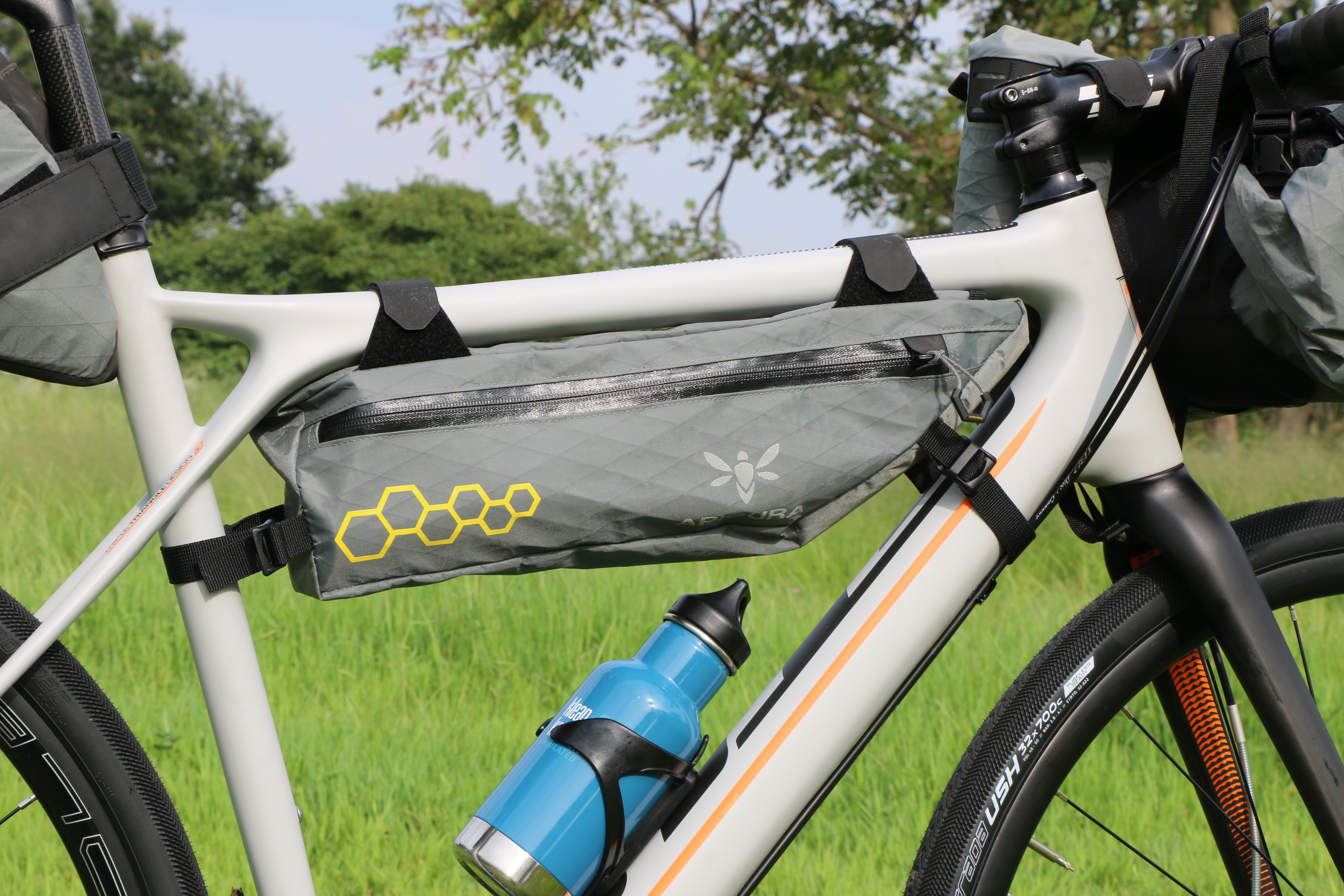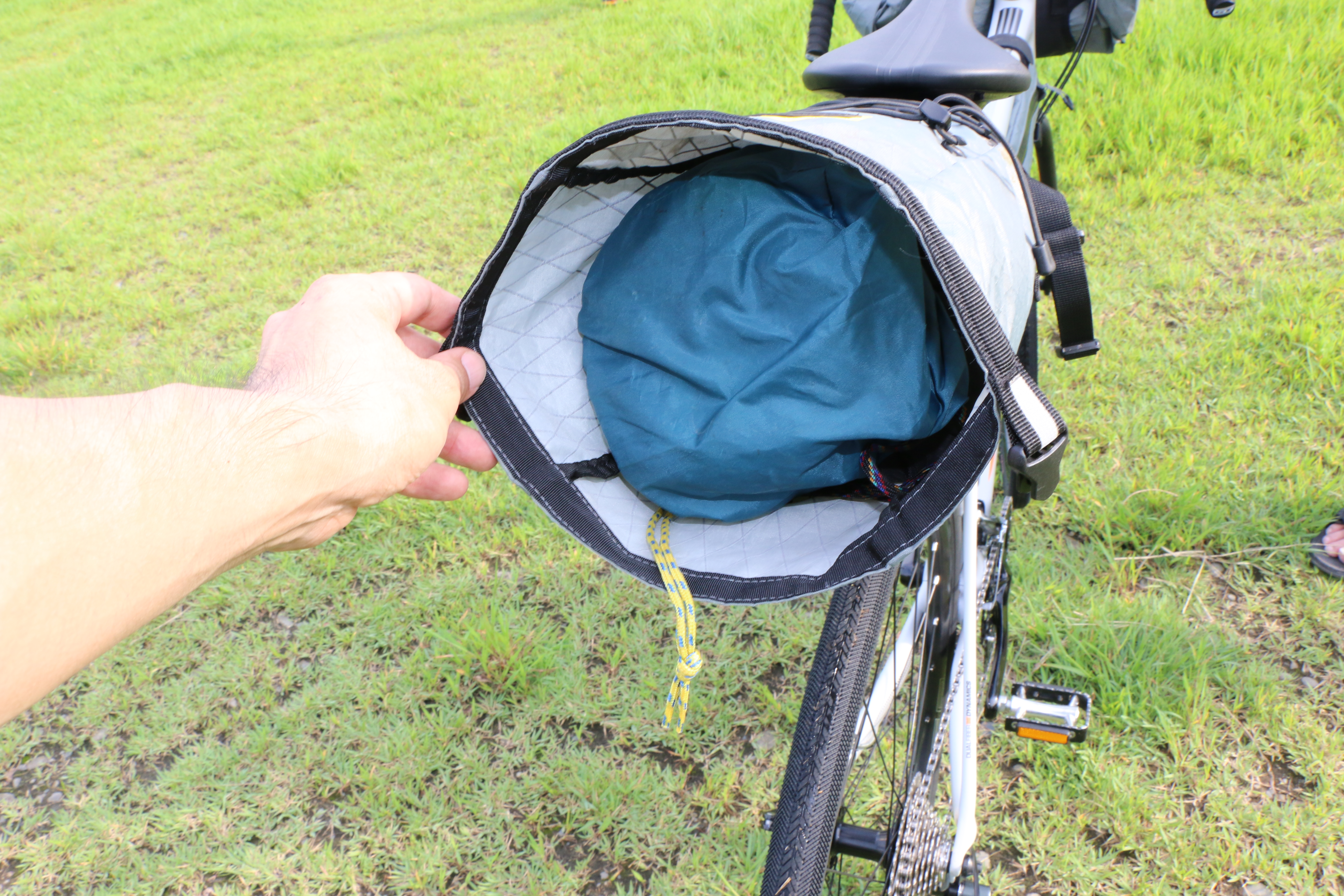 フレームバッグもAPIDURA製。今回はスモールサイズ(9980円)を使用しましたが、もっと大きなサイズも選べます。長さのあるフレームバッグは、テントのポールなどを収納するのにちょうど良い。