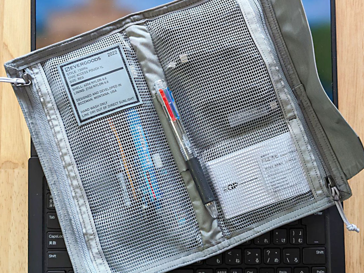 まとめるための収納ポーチに選んだのは、EVERGOODS(エバーグッズ)の「CIVIC ACCESS POUCH 1L」(9350円)。設立から10年も経っていないアメリカの新興バッグブランドで、アイテム数も多くはないのですが、手掛けるバッグやアクセサリーは個人的にツボなモノばかり。