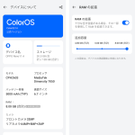 CPUはMediaTek Dimensity 7050(最大2.6GHz)。ミドルレンジ向けのチップですが、前モデルのReno9 Aが採用していたSnapdragon 695(最大2.2GHz)よりも高性能で、コストパフォーマンスも向上しているとのこと。筆者の率直な印象では、操作感は前モデルと同等。ただし、前モデルでは最大90Hzだった画面リフレッシュレートが最大120Hzになり、画面スクロール時のなめらかさは向上しています。