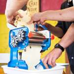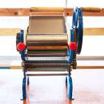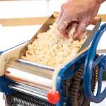 圧縮時の“圧幅”を変えるツマミや、粉や麺帯を流し込む上皿が少々チャチくも映りますが、鋳物のボディによってなかなか重量感。作業時にも動いたりすることなく、しっかりとした製麺ができそうです。