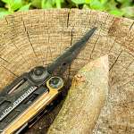 この写真で割っている薪はギリギリマルチツールでも刃が深くまで入りますが、もっと太い薪ですと、薪の直径に対し、端っこしか刃が届きません。なので、あえて、折り曲げて使っています。