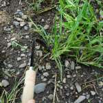 このカギカマの使い方は普通の鎌と全然違います。雑草の根元付近の土に横方向斜め45度くらいで鎌を突き刺します。雑草のサイズにもよりますが、鎌の曲がりの部分まで突き刺せるようであれば、できるだけ深く差し込みます。そして、手前上方に向かってすくいあげるように鎌を引くと、鎌が土中の根を切り雑草を地面から引きはがせます。