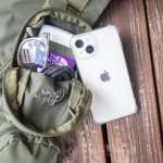 参考までに、実際の使用例を紹介します。上部の縦長のポーチには、スマホ、モバイルバッテリー、コード、そしてサングラスを収納。