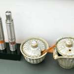 ▲卓上に置かれた調味料。スティック状のものは、七味と削りたての山椒。ツボには別の山椒と鰻のタレが