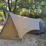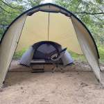 テントと組み合わせるとこんな感じ。テント入り口をすっぽり幕で覆ういわゆる“小川張り”ですが、テントの天井部分と密着しているためでしょうか、風によるブレは少なく安定感あり。