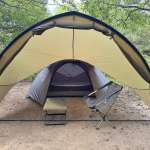 テントのパネルを跳ね上げられるものであればタープなしでもリビングを作れますが、夜はパネルを閉じるのでチェアやテーブルの置き場所に困る!