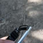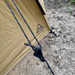 自在金具は樹脂製の三角型。自在内側にギザがあり、挟み込まれた張り綱にしっかり食い込みます。ちなみに付属の細めの張り綱は、夜間の視認性がいいものの、昼間はステルス性能抜群。気をつけましょう。