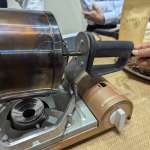 カセットこんろのトップメーカー イワタニが、手回し式の焙煎機を出展していました。もちろんカセットこんろのゴトクにぴったりハマる仕様です。