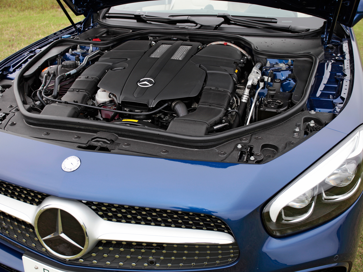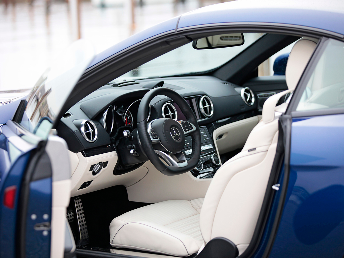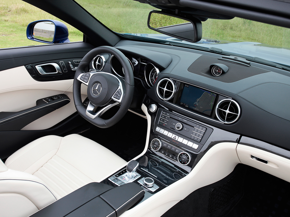 前後重量配分を、900:880kgと、良好に振り分けた新型SL。強化されたパワートレイン、リファインされた足まわりと併せ、スポーツカーとして、あなどれない実力を持ちます。クローズド時はもとより、屋根を下ろした状態でも、サイドウインドウを上げ、乗員の背後にある“電動ドラフトストップ”(ウインドディフレクター)を立てれば、キャビンへの風の巻き込みを最低限にできます。