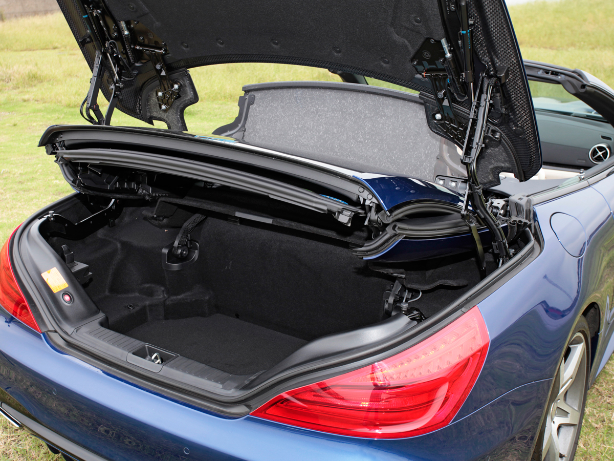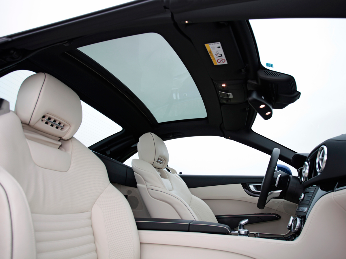 ただでさえ重量がかさむ折り畳み式ハードトップのルーフ部分が、なんとガラスルーフになっています! これは重たい…。血を吐く思いで(!?)グラム単位の軽量化を図っているスポーツカー開発者にとって、重量物をクルマの最も高い位置に持ってくるSLのレイアウトを見たら、目をむくのではないでしょうか(ちょっと大袈裟)。しかも、ご丁寧にサンシェード付きです!