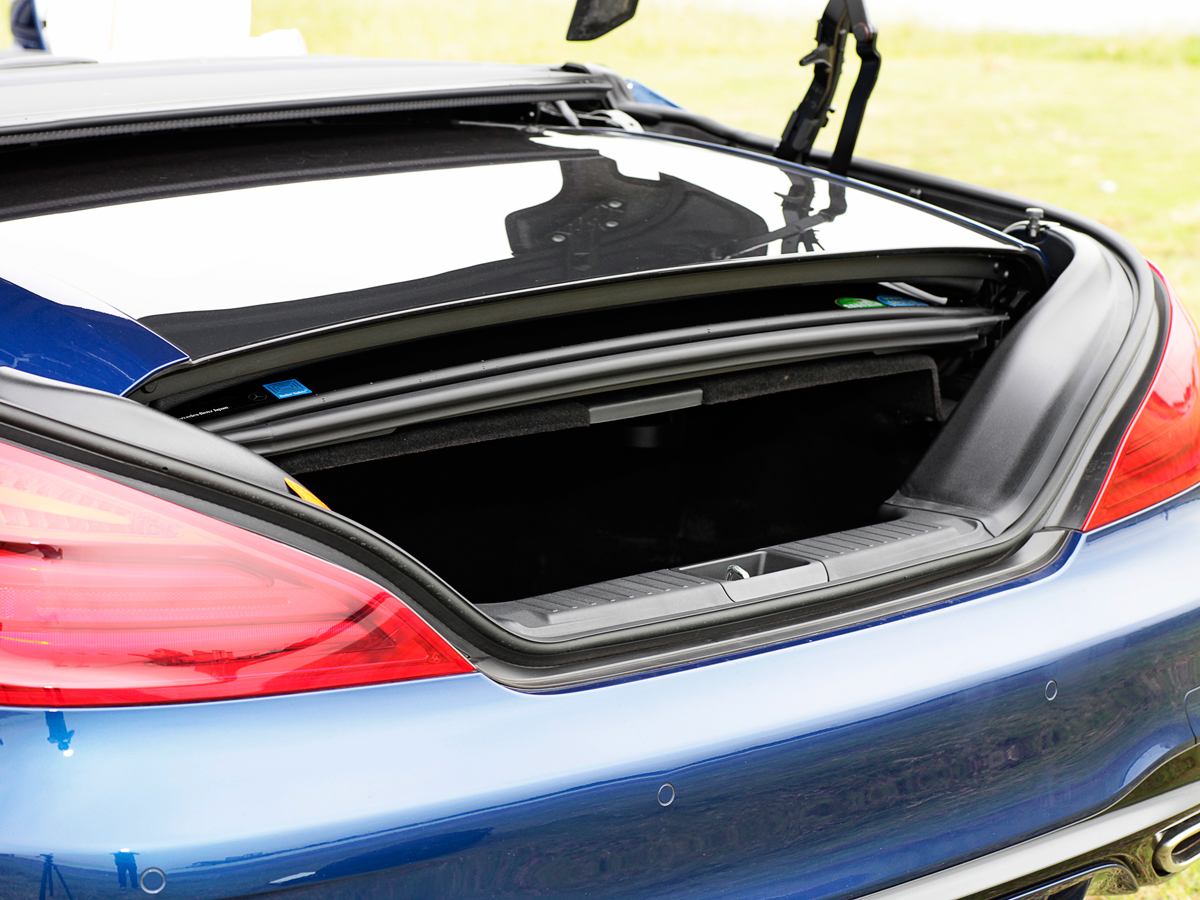 気持ちよくドライブして、目的地に到着。運転席からリアにまわって、トランクから荷物を出そうとすると…。オープン状態、つまりルーフ部分やリアガラスがトランクに収納されている時でも、トランクのオープナーにタッチすると、トランクリッドが開くと同時に収納されているパーツ類が自動で跳ね上がり、広い開口部を作ってくれます。荷物の出し入れが容易。便利です。