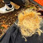 まずは30~40cmくらいの長さの麻紐を半分に折って、二つ折りの状態にします。こうすると同時に2本分をほぐすことができるので、効率が良いです。