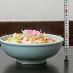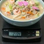 待つこと数分。目の前にやってきたのは…で、でかい、ど迫力のちゃんぽん。そして納豆もがっつり載っている! さぁ、早速計測です。直径約25cmのどんぶりに、高さ約12.5cm、重さは2134g(器の重さを除く)。