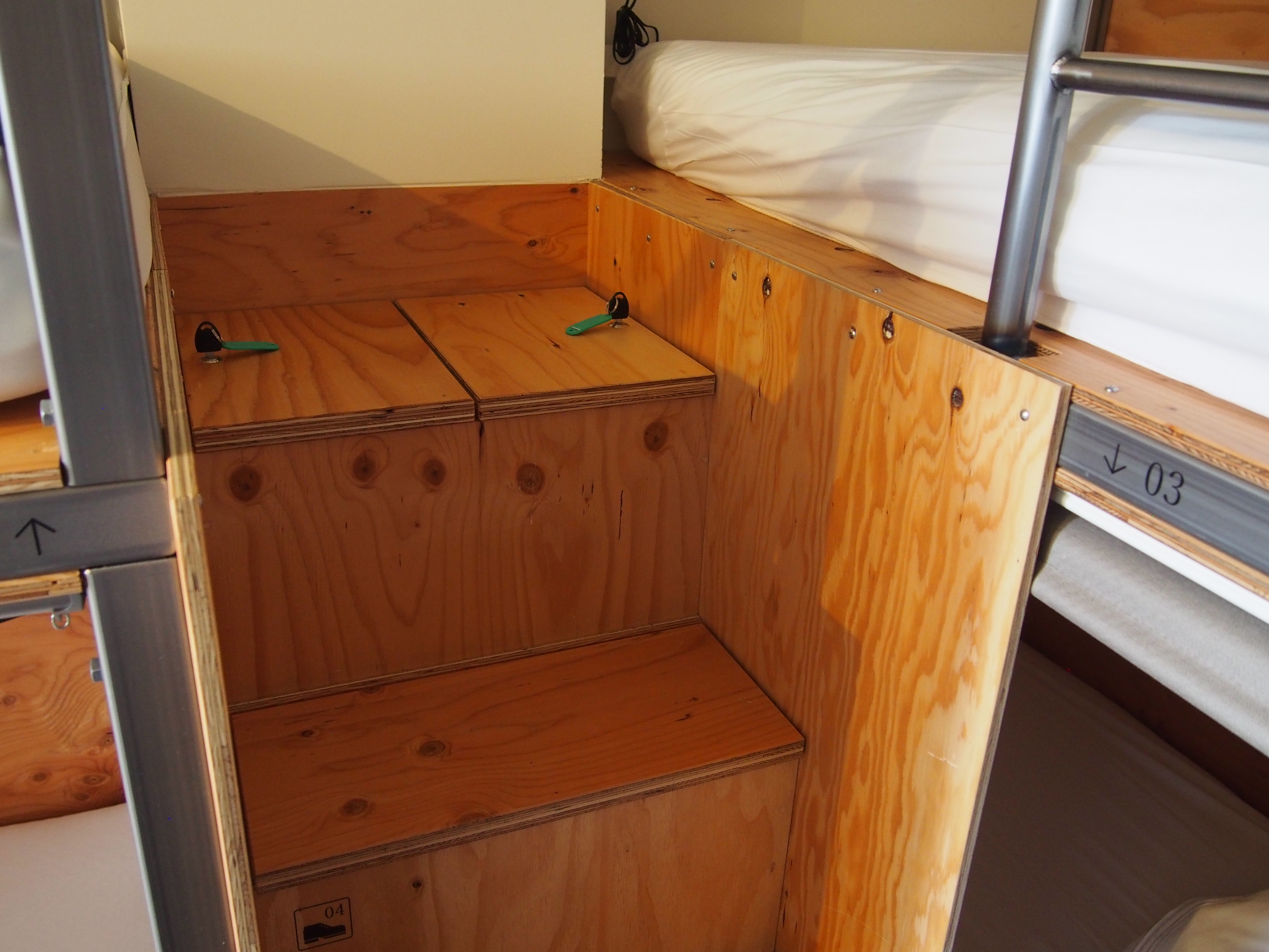 すべてのベッドに鍵付きの収納ボックス、読書灯、コンセント口、USBジャックが用意されています。このUSBジャックは電源アダプタなしでiPhoneが充電できるのでかなり便利。コンセント口は3口あり、USBジャックも2口あるので、充電するものがたくさんある旅行や出張中にうれしい仕様です。また、個室ならベッドサイド以外にもコンセントがありました。もちろん、館内では無料のWi-Fiが利用できるので、パソコンやスマホでの作業も捗ります。