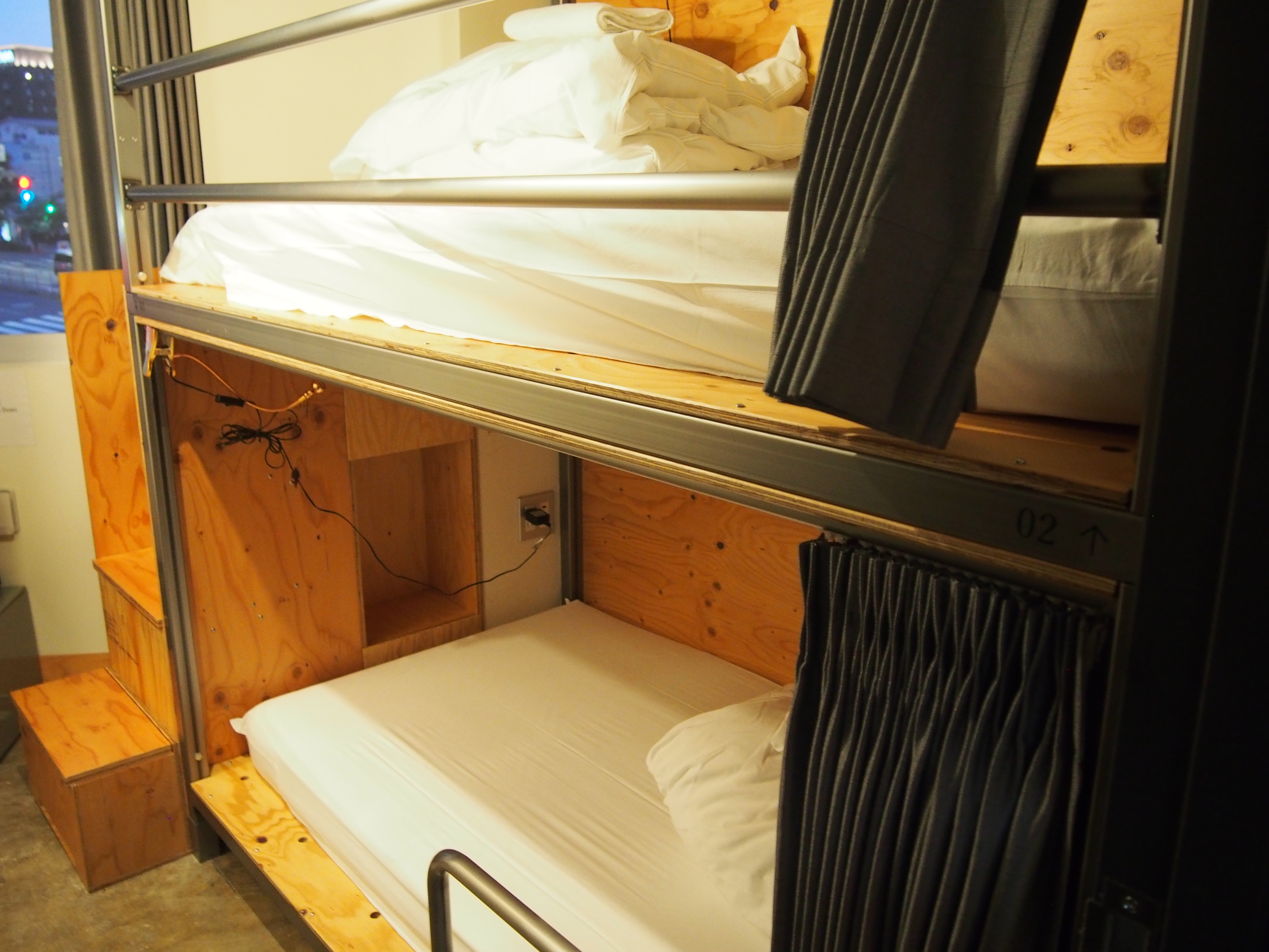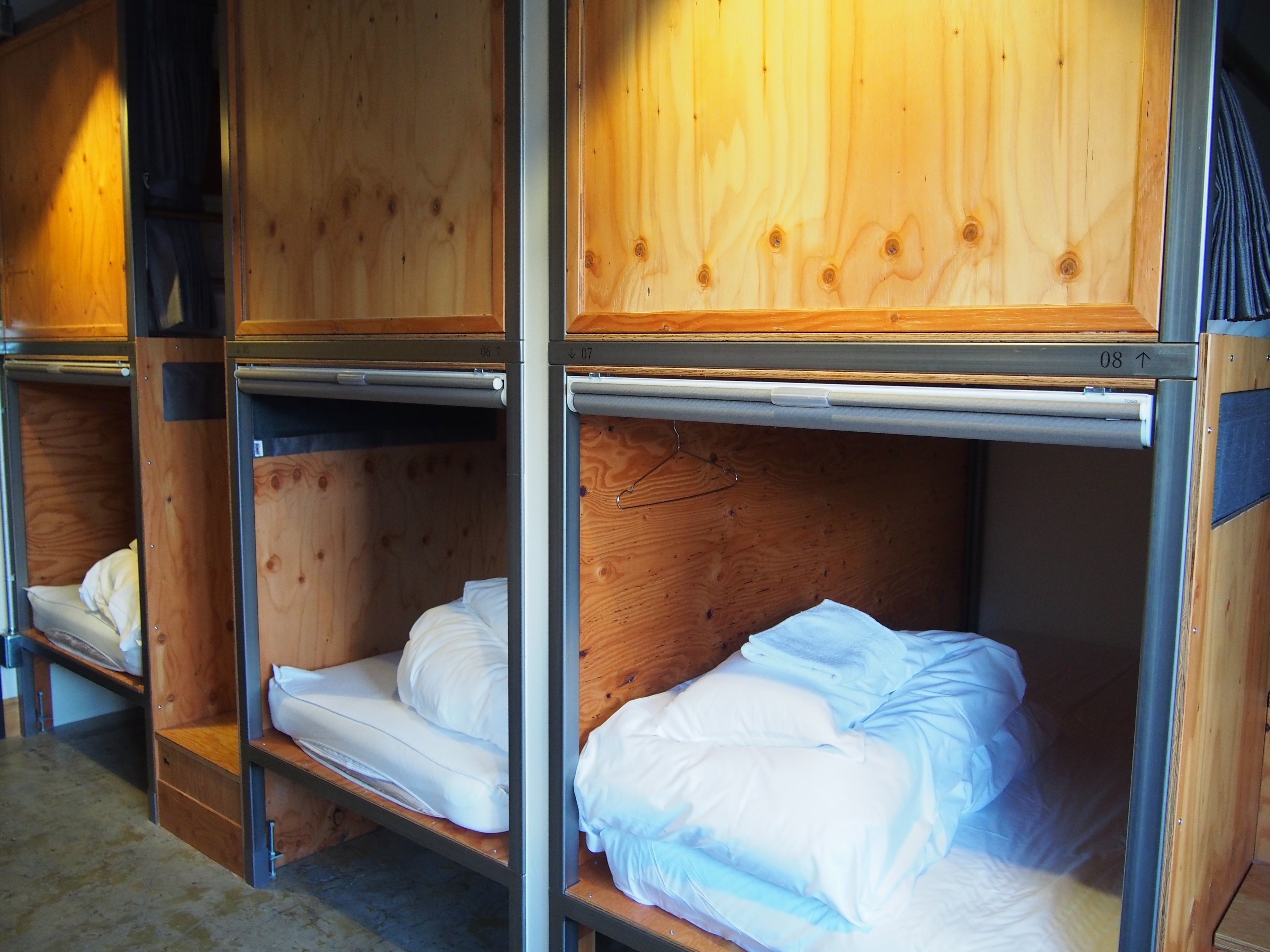 個室には、2段ベッドと洗面台があります。決して広いとはいえませんが、寝るときに滞在するのがメインなので、あまり気になりませんでした。このホステルで注目すべきは、すべてのベッドにシモンズ製のマットレスを導入している点。程よい硬さのマットレスで、短時間でも良質な睡眠がとれるようにとの配慮から導入したそうです。