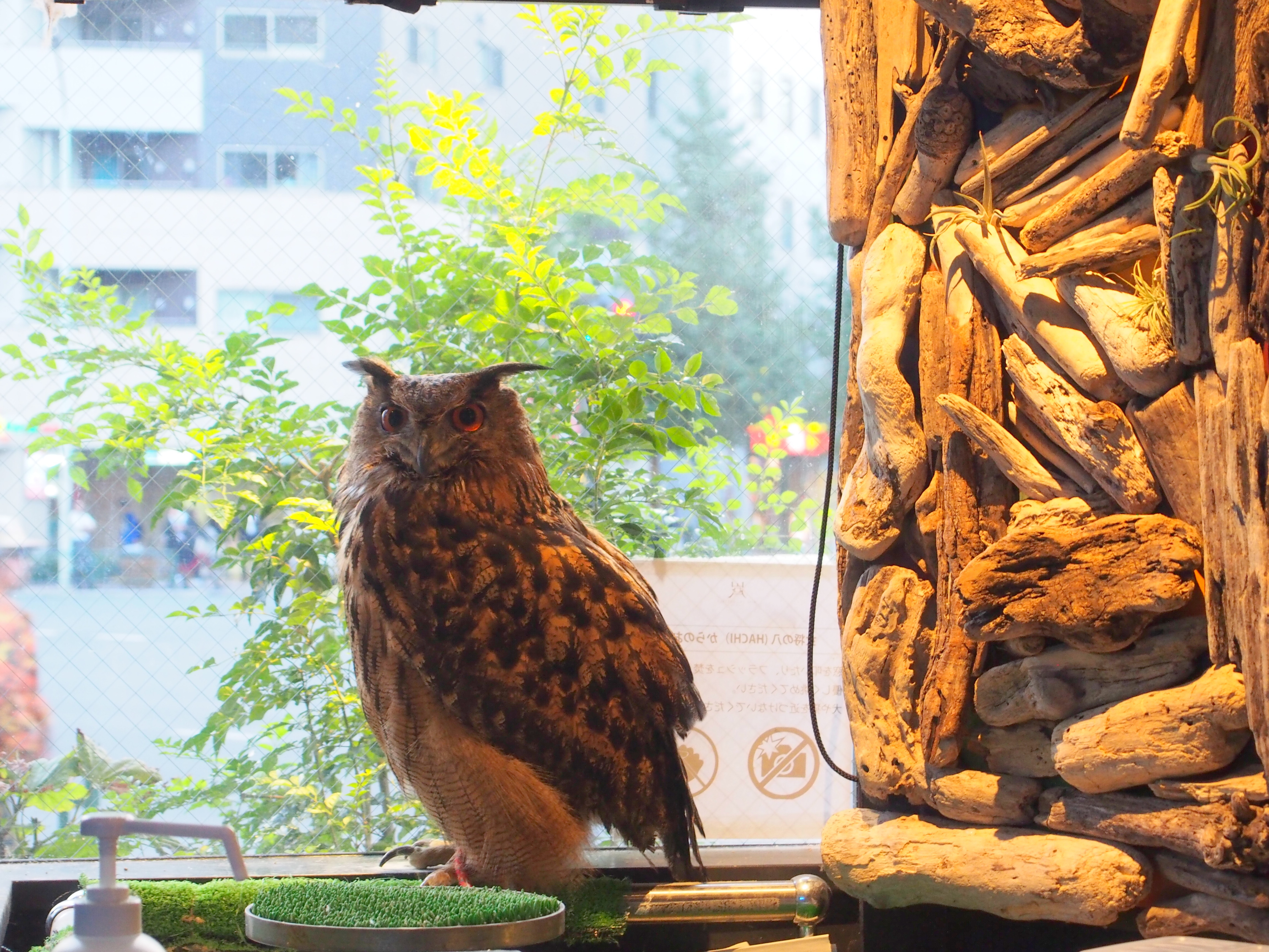 この子はユーラシアワシミミズクの1歳の女の子。このホテルの女将に就任しており、名刺まで持っているのだとか。外の様子を興味深く眺めており、ホステルの外を行き交う人たちも「ふくろうがいる!」と足を止めているのをこのあと何度も見かけました。