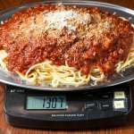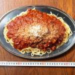 待つこと数分。目の前にやってきたのは、ソースたっぷり、そして麺量たっぷりのミートソーススパゲティ。これは見ただけで1kg以上あるってわかる! 早速計測です。