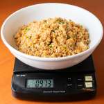 待つこと数分、目の前にやってきたのは、巨大な器に盛られた褐色の山! 早速計測です。直径約25cmの器に盛られたチャーハンは重さ973g(器の重さを除く)。見た感じ、ネギらしき緑と黄色の卵が見える、シンプルなチャーハンです。