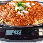 幅32cm、奥行18cmの大きめの器に盛られたミートソーススパゲティは、スケールに乗せると重さは1033g(器の重さは除く)。おお〜。まさに特盛!