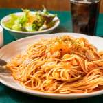 ▲「たっぷりシーフード(トマトソース)」の超大盛り(1330円)。スープ、サラダ、ドリンク付き