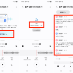 ▲(左)「ボイスレコーダー」アプリで録音したデータを開き「文字起こし」をタップ。(中)処理が実行され…。(右)話者のラベル付きで文字起こし内容が表示された。テキスト化された内容はちょこちょこ間違ってはいるものの、十分及第点だろう