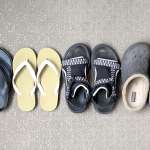 ▲左からビルケンシュトック「ホノルル EVA」、Hippobloo(ヒッポブルー)のビーチサンダル、Tevaのスポーツサンダル、クロックスのもこもこクロッグサンダル(冬用)