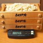 待つこと十数分。目の前にやってきたのは茹でたてのうどんがマス型のざる3段分。早速計測です。うどんが入っているマス型のざるは幅28cm奥行き16cm、3つを重ねて麺を測ると重さは1124g、肉汁は直径14cmの器に重さ437g(ともに器の重さを除く)。トータル1561g。締めに茹で汁を入れて飲み切るなら1.7kg超えは確実です。